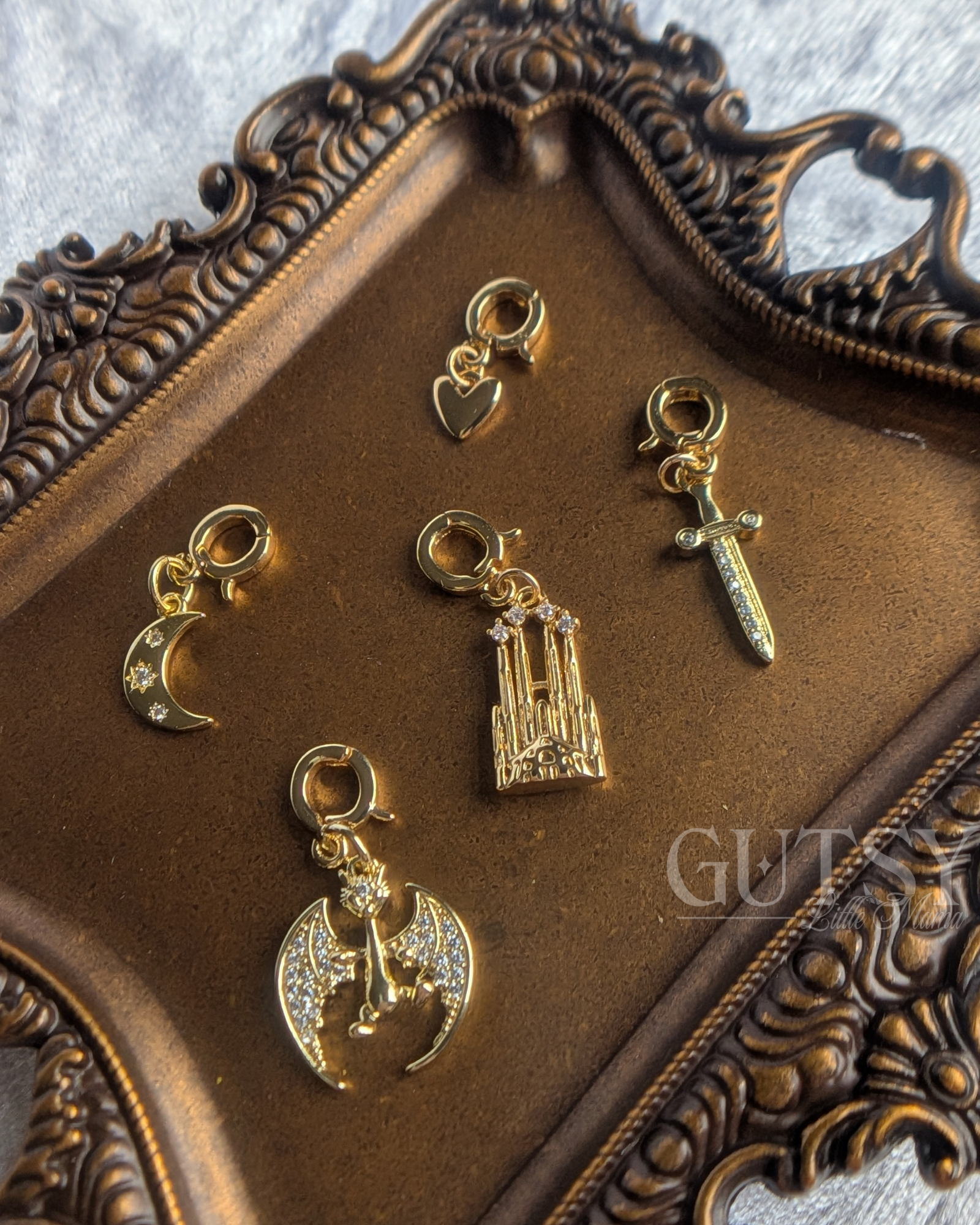 Choose from a rotating archive of heirloom-inspired charms — each symbol steeped in the language of fantasy: