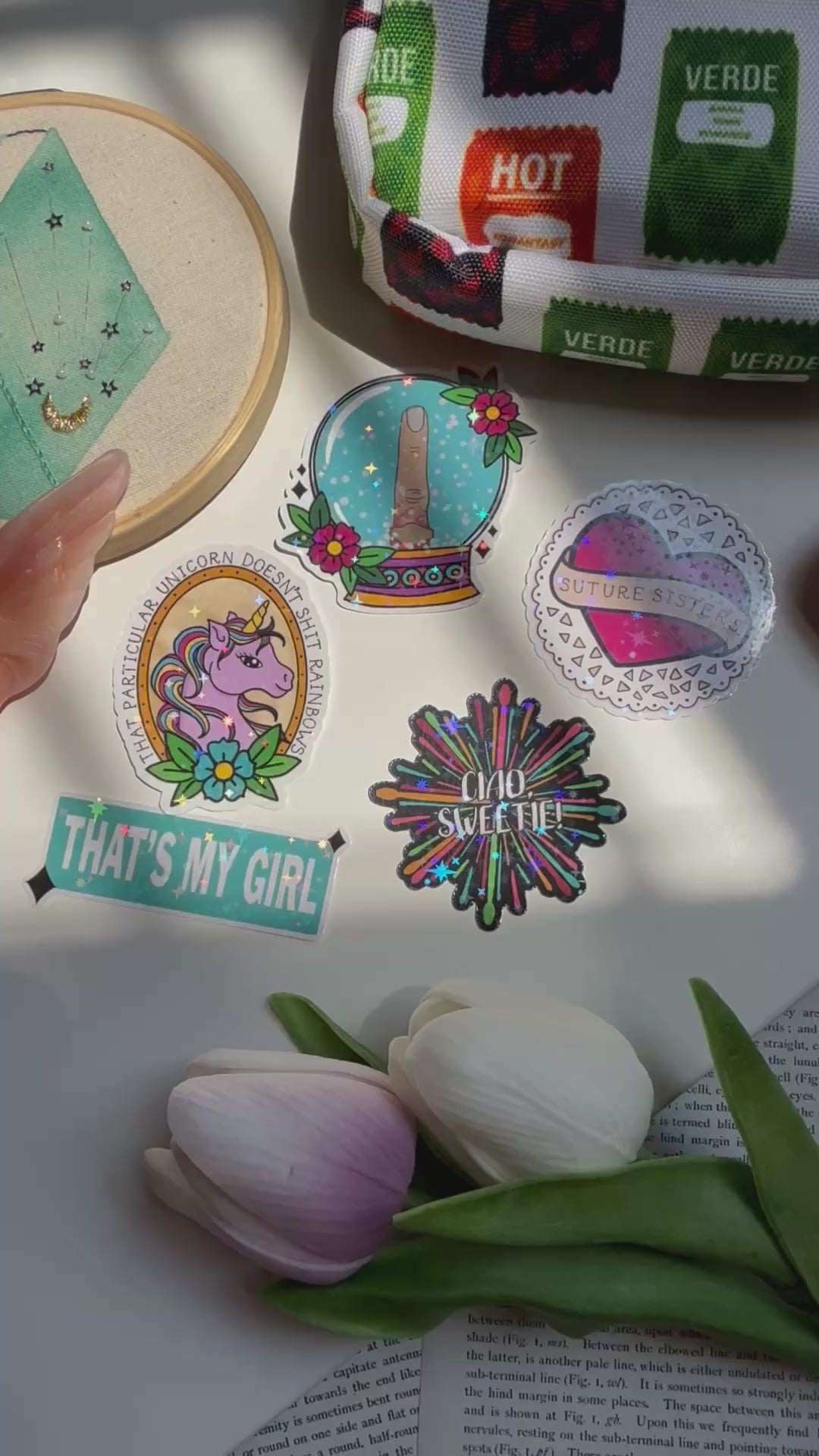 This set is for FIVE (5) stickers: Unicorn, That's My Girl, Ciao Sweetie, Suture Sisters, and Finger Snowglobe!