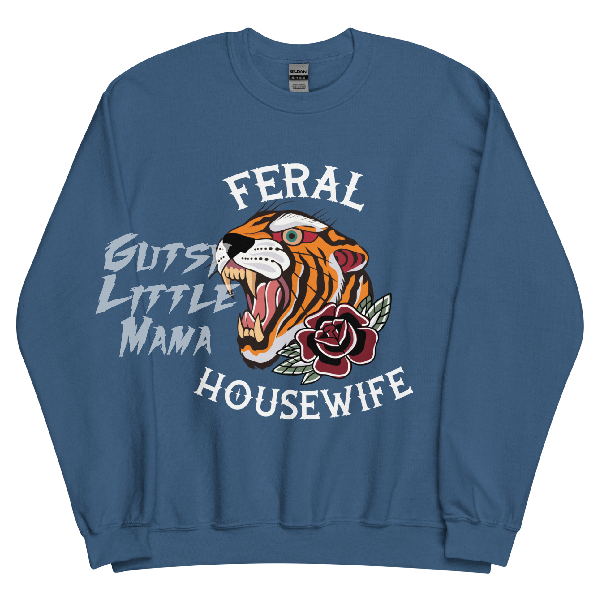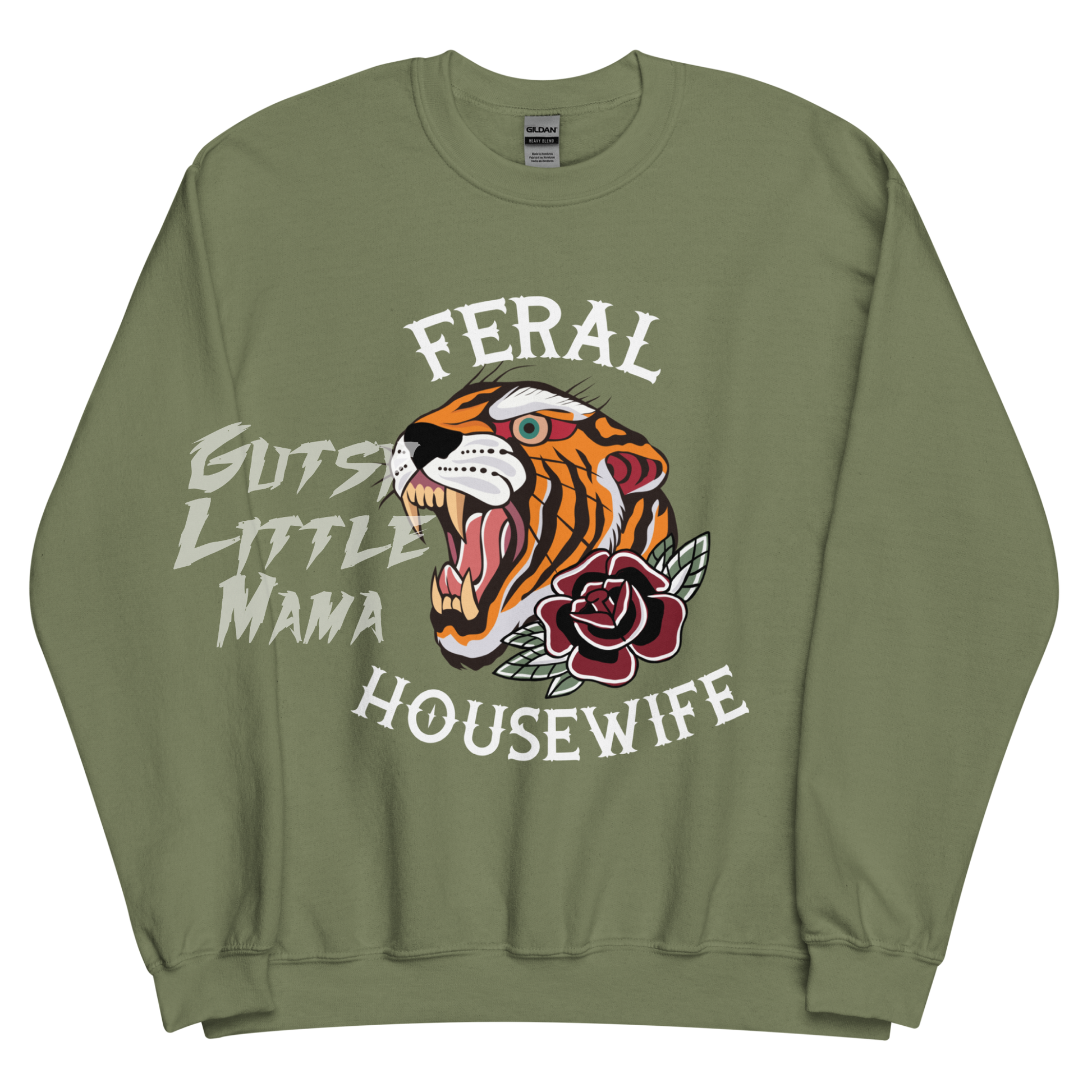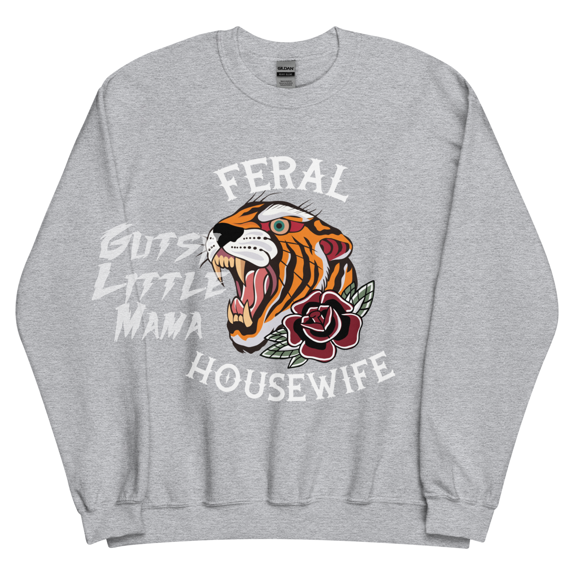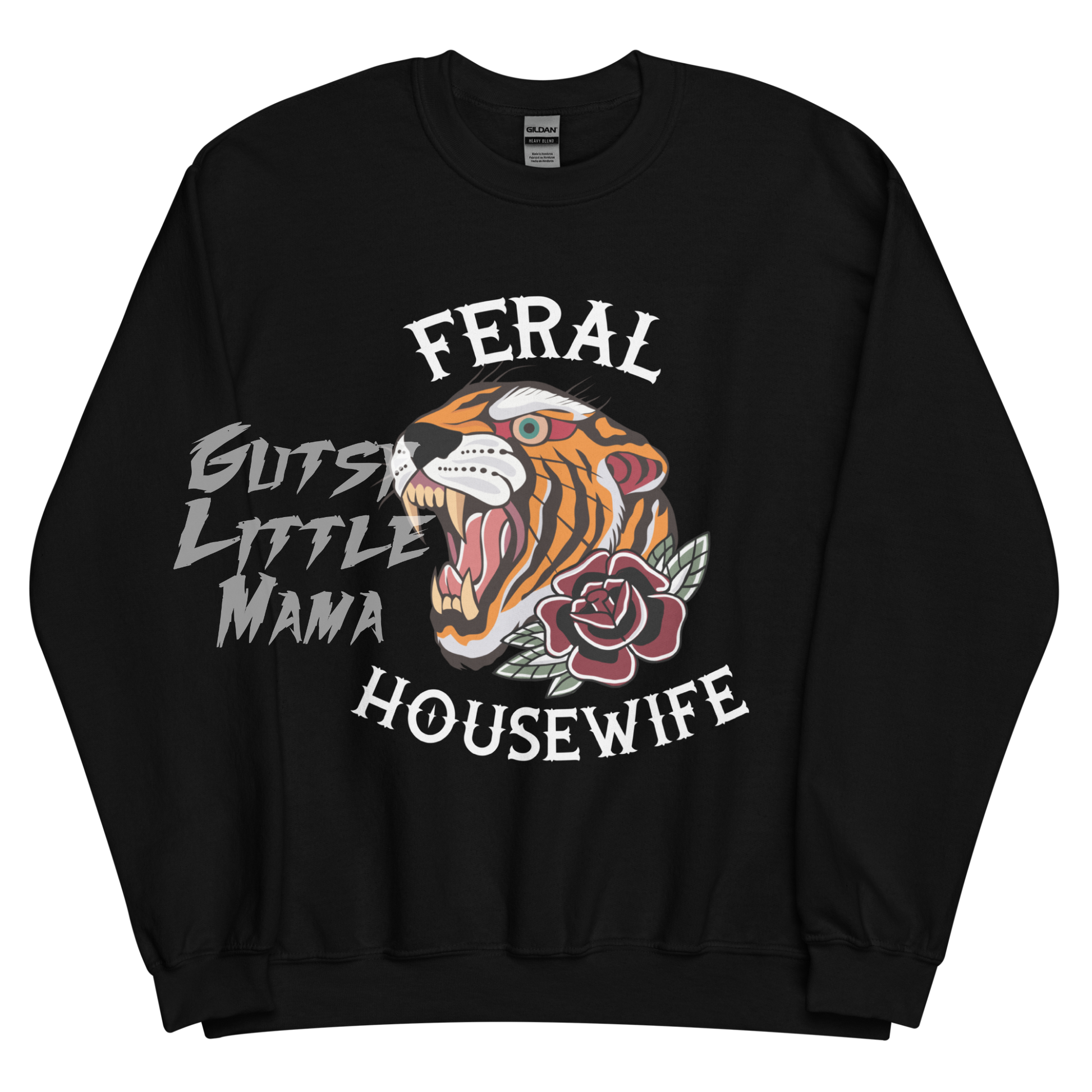 Classic Gildan heavyweight super cozy sweatshirt with our signature Feral Housewife design printed on the front.