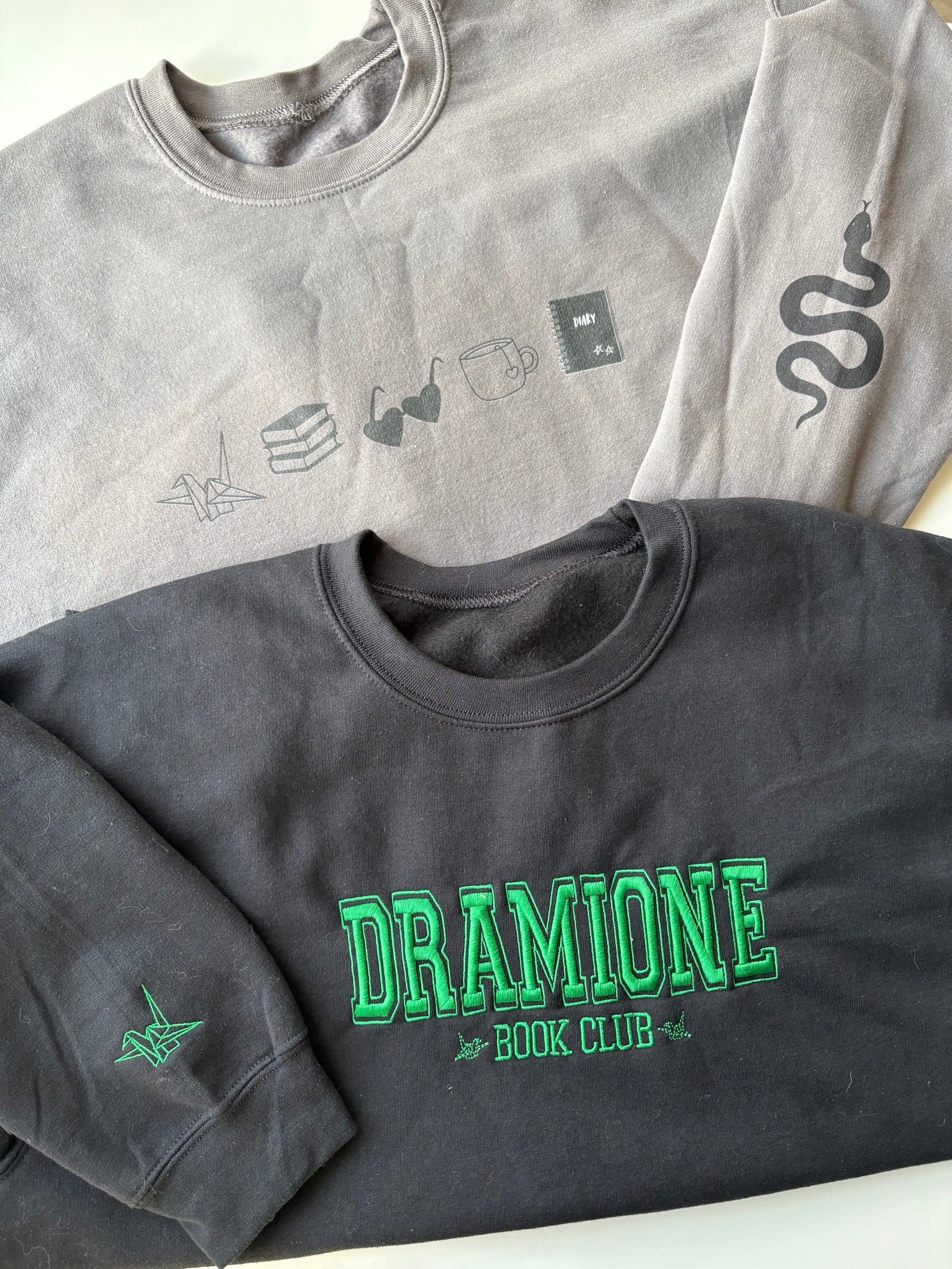 - Dramione Fan Fiction Crew: Two options: A cozy crew featuring printed elements from some of our favorite fan-fics and gorgeous snake sleeve details OR